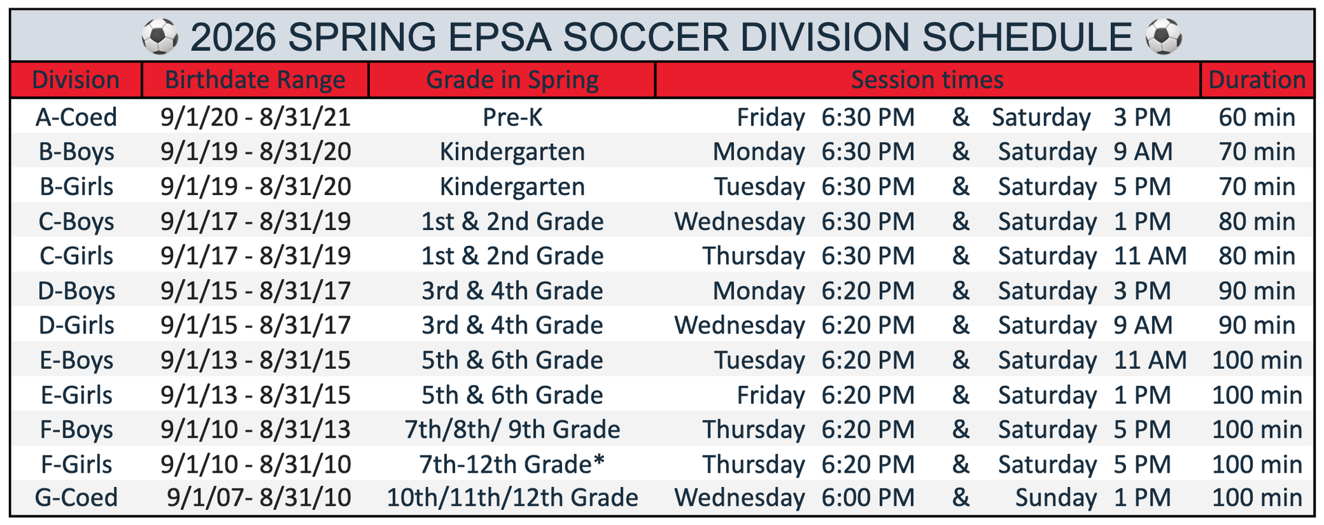 - 10th - 12th grade girls may choose to play in F Girls, G Coed, or both.